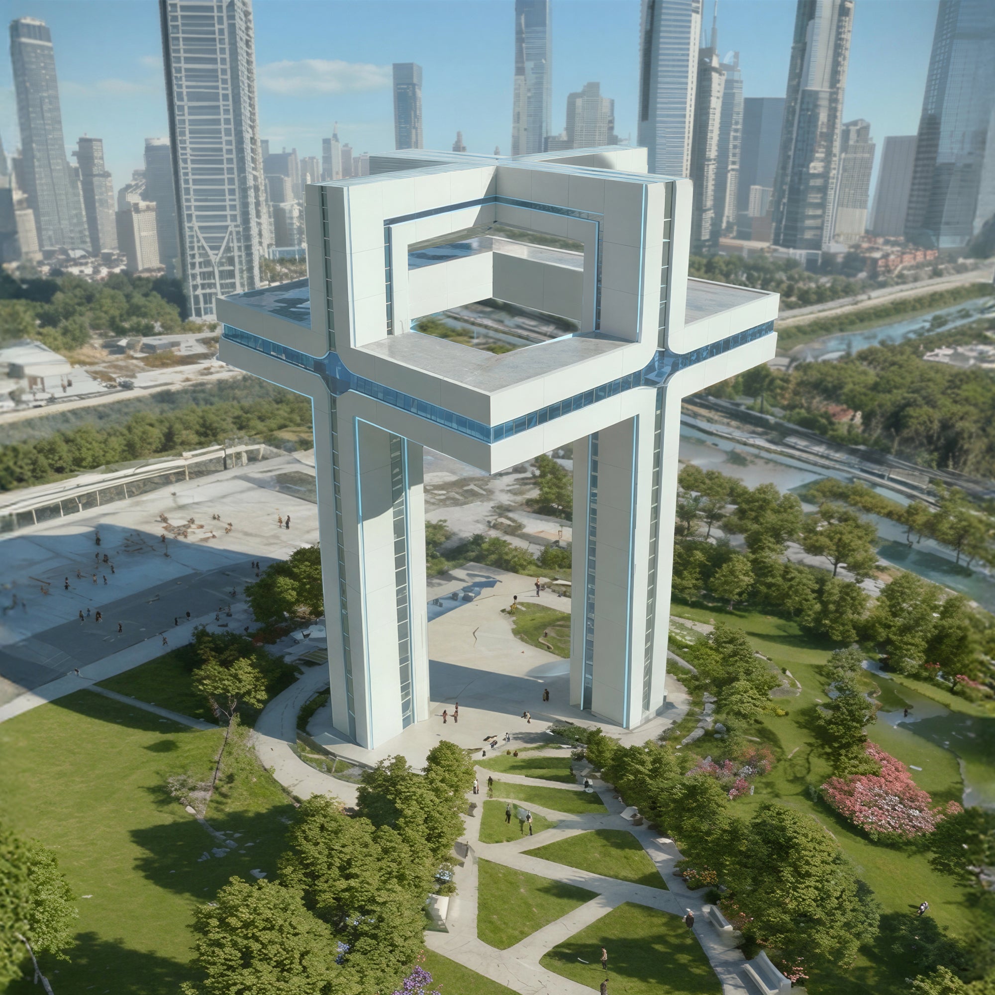 In dense metropolitan contexts, the project operates as a civic landmark. Embedded within a public park, it reads as a sculptural gift for the future city, an object that warps time while anchoring the present. Rising vertically within the city, the structure weaves itself into the urban fabric as both monument and refuge.