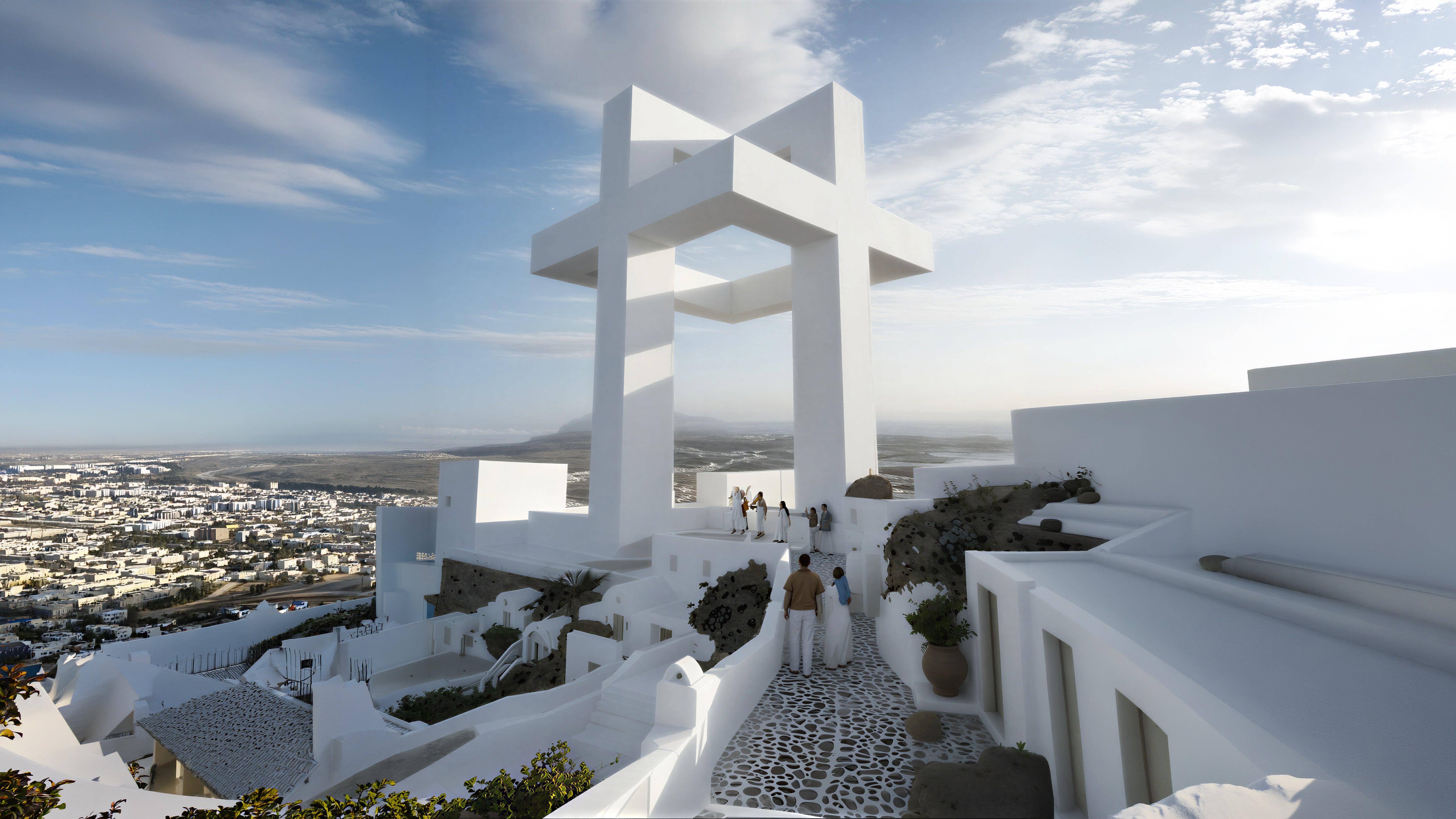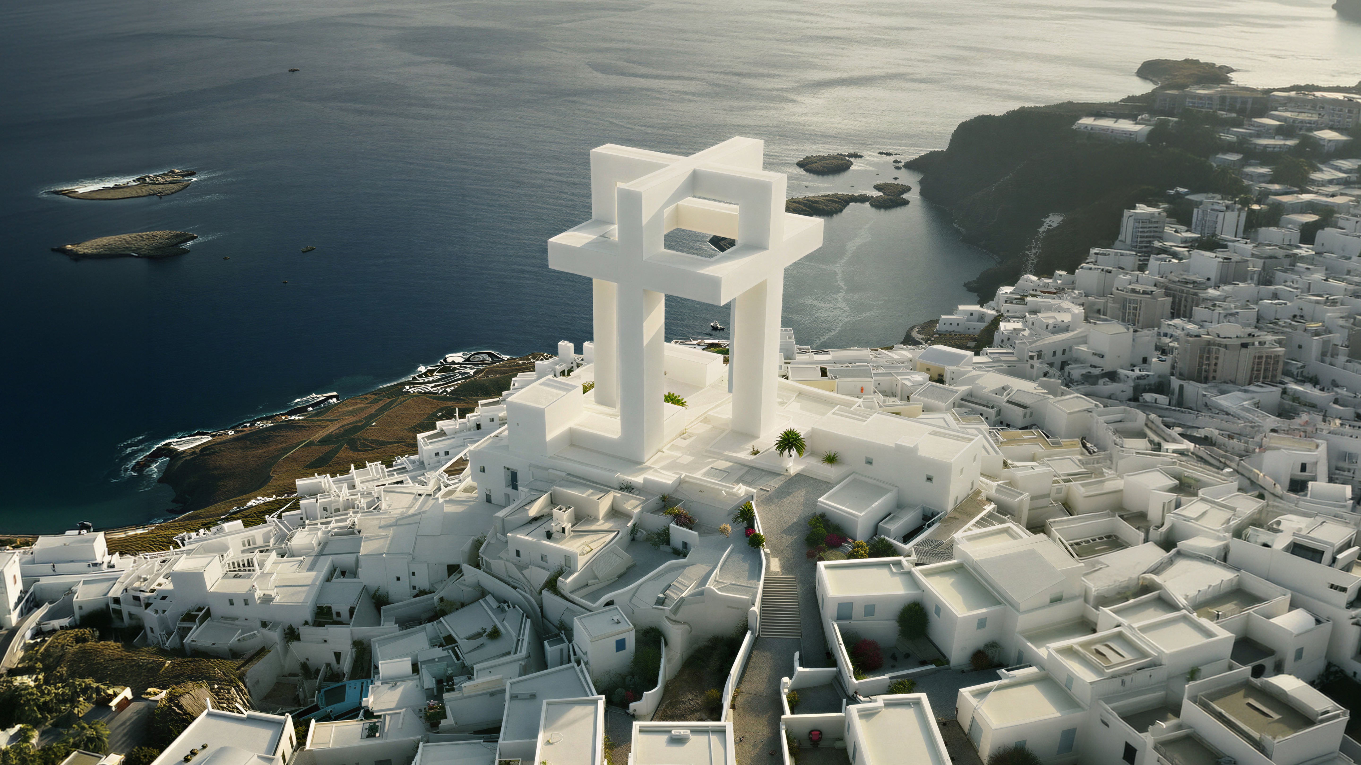 In Santorini, the project becomes pure presence. Interior functionality is removed, allowing the structure to exist solely as a place of prayer and introspection. Set against the vast horizon, overlooking land and sea, the monument is not entered but approached, contemplated, and felt, a silent marker of faith within the landscape.