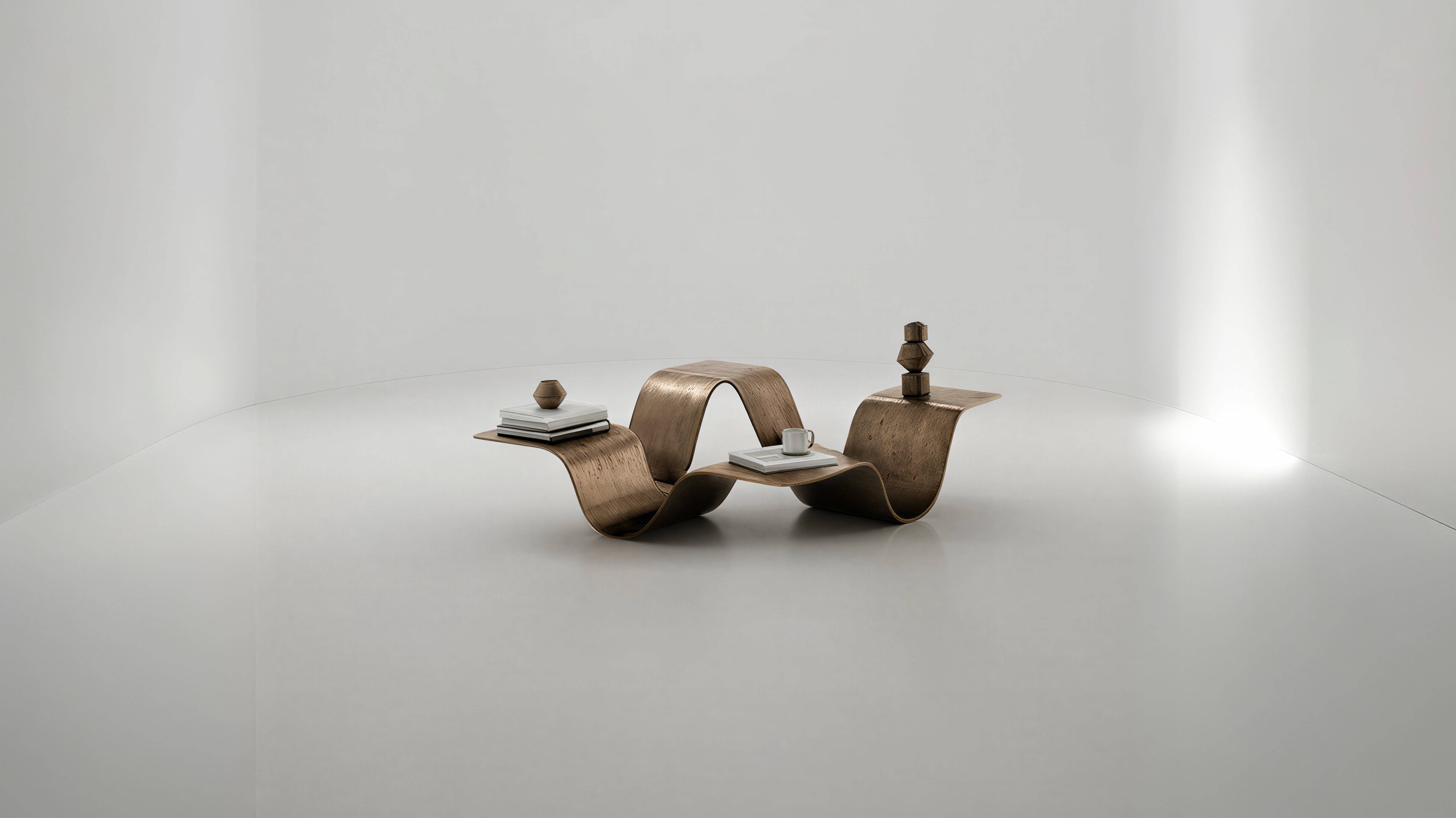 Subtractive and organic, the Warp Table is a study in individuality emerging from a singular whole. By removing the center of a common square plane and gently warping its perimeter, the object resolves into four distinct offering trays. A single surface is transformed into a multidimensional form, blurring the boundary between contemporary sculpture and functional design.